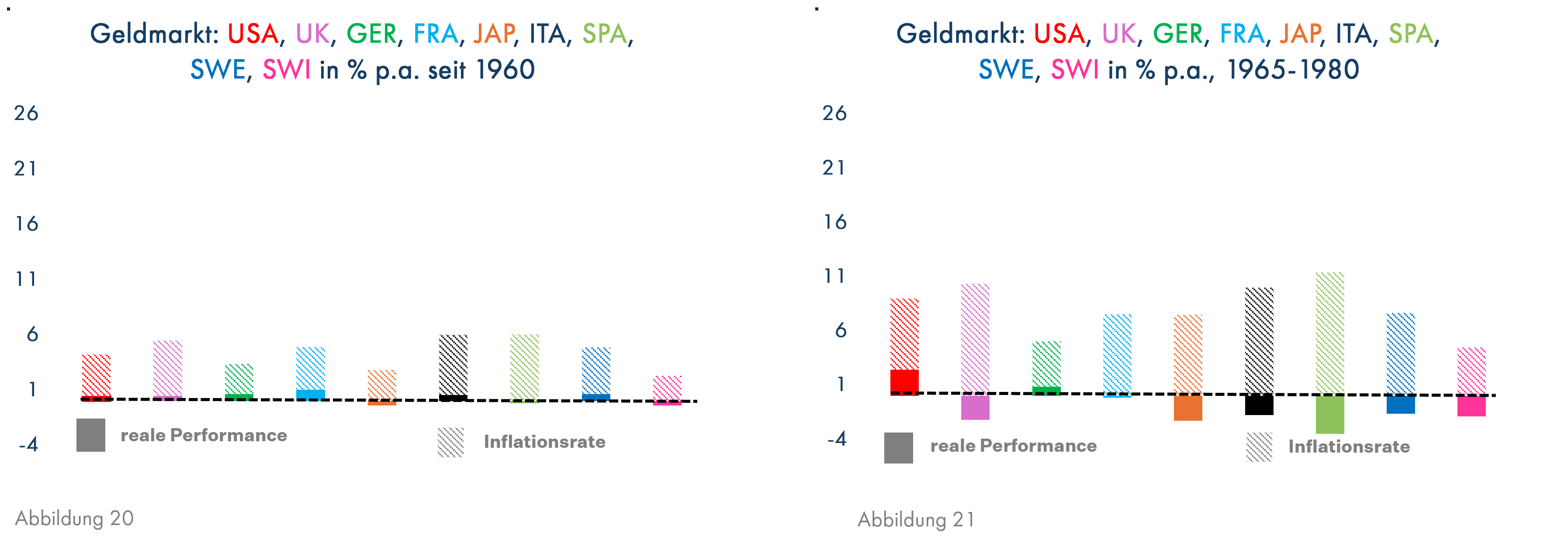 Die Grafiken zeigen, dass Geldmarktanlagen seit 1960 überall nur die Inflation ausgleichen konnten (Grafik 20), wobei hier keine Besteuerung einkalkuliert ist. In Inflationszeiten wird dann der reale Ertrag sogar meistens negativ (Grafik 21). Dies lässt sich auf die heutige Zeit gut übertragen. Beim Corona-Inflationsschub blieben die Geldmarktzinsen weit unter den Inflationsraten und wurden von den Zentralbanken nur sehr zögerlich angepasst. Ein auch zukünftig gültiger Grund dafür ist die im Vergleich zu den Jahren bis 1980 heute wesentlich höhere Staatsverschuldung. Die Staatsanleihen mit 10-jähriger Laufzeit würden die Schwäche von Zinsanlagen wie dem Geldmarkt nur noch deutlicher zeigen, daher habe ich sie in diesen Vergleichsgrafiken weggelassen. Grafik 28 zeigt, dass langlaufende Anleihen zwischen 1964 und 1980 in allen Ländern außer in der soliden Schweiz, die seit Jahrhunderten keine Kriegskosten zu stemmen hatte, und Deutschland, das nach dem 2. Weltkrieg durch Währungsreform und einen Schuldenerlass der ehemaligen Kriegsgegner fast schuldenfrei war, teilweise wesentlich schlechter als Geldmarktanlagen abgeschnitten hatten.