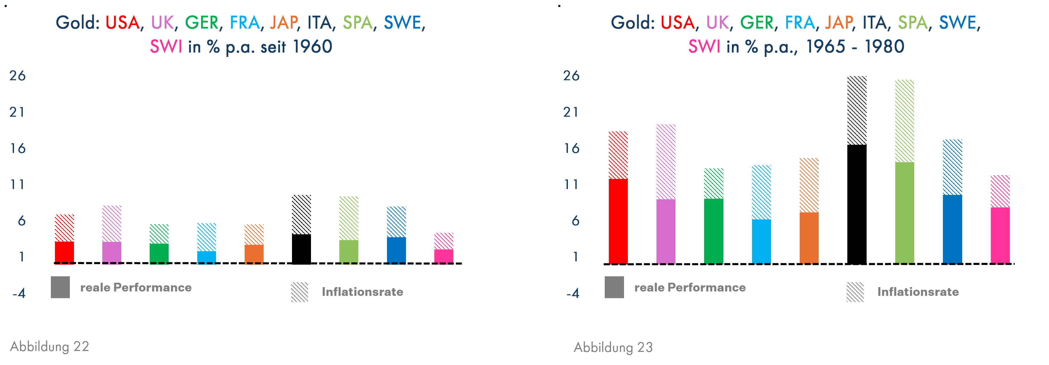 Gold brachte über den langen Zeitraum seit 1960 moderate positive reale Erträge (Grafik 22), bei hoher Inflation allerdings sehr hohe Preissteigerungen (Grafik 23). Dies dürfte sich bei einer künftigen Phase höherer Inflation nicht wiederholen, da der Goldpreis nach einer einmaligen Anhebung im Jahr 1933 bis 1968 politisch festgelegt war und nach der allmählichen Freigabe dann zunächst die aufgelaufene Unterbewertung aufholen musste. Sollte es allerdings zu verschärften Bonitätsdiskussionen kommen, sind auch bei moderater Inflation weitere deutliche Kurssteigerungen zu erwarten.