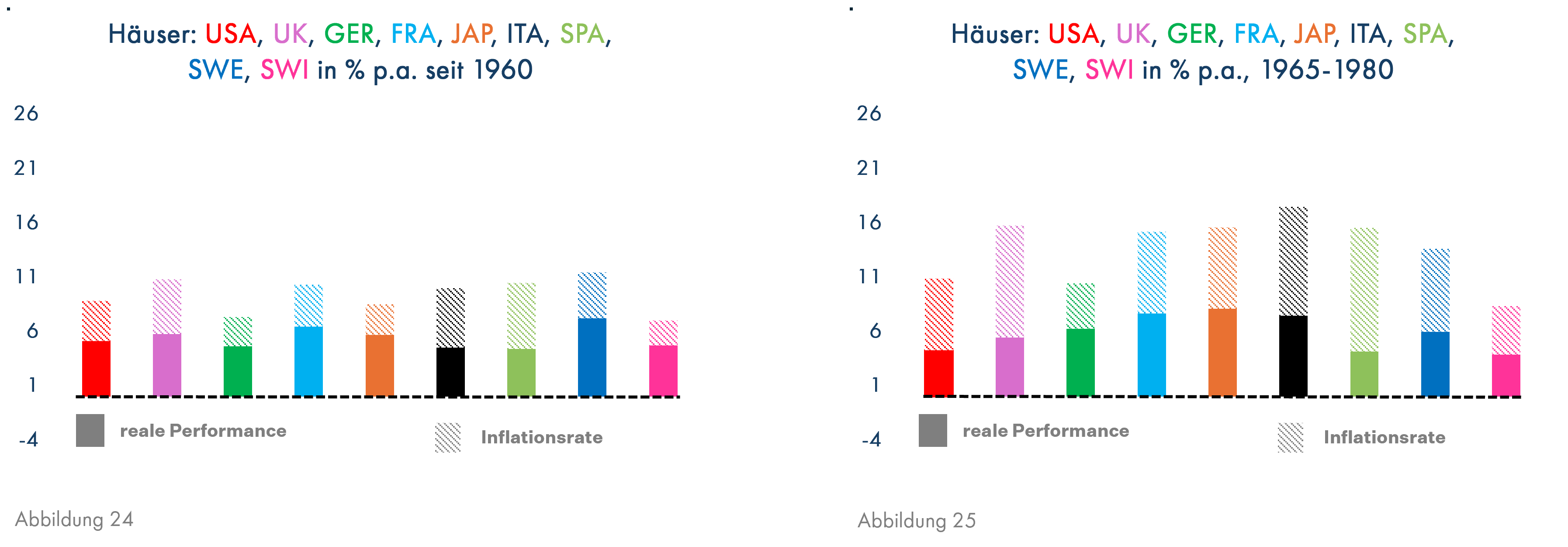 Wohnimmobilien erwirtschafteten aufgrund der laufenden Mieterträge seit 1960 deutlich höhere reale Erträge als Gold, hier ohne Fremdkapital gerechnet (Grafik 24). In der Inflationsphase ab 1965 waren sie nur in einigen Ländern deutlich ertragreicher als im gesamten Betrachtungszeitraum (Deutschland, Frankreich, Japan, Italien, Grafik 25). Insgesamt sind Wohnimmobilien diejenige Anlageklasse, die in allen Ländern und auch unabhängig vom Betrachtungszeitraum solide positive reale Erträge erwirtschaftet hat.