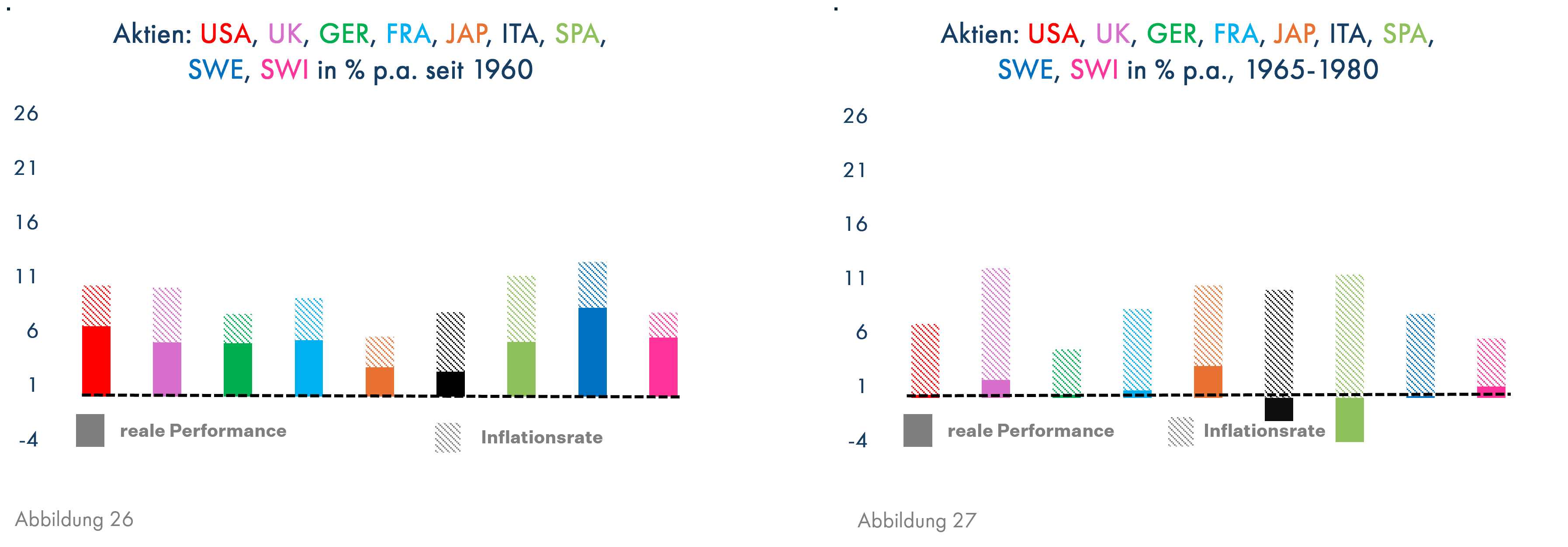 Die realen Aktienerträge waren im Gesamtzeitraum seit 1960 nicht wesentlich anders als die der Wohnimmobilien (Ausnahmen: Italien und Japan, Grafik 26). Allerdings schnitten sie in der Inflationsphase überall außer in Japan deutlich schlechter ab als im Gesamtzeitraum und überall deutlich schlechter als Wohnimmobilien (Grafik 27). Dies bedeutet natürlich auch, dass Aktien in Phasen mit wenig Inflation stärker als Wohnimmobilien abgeschnitten haben.