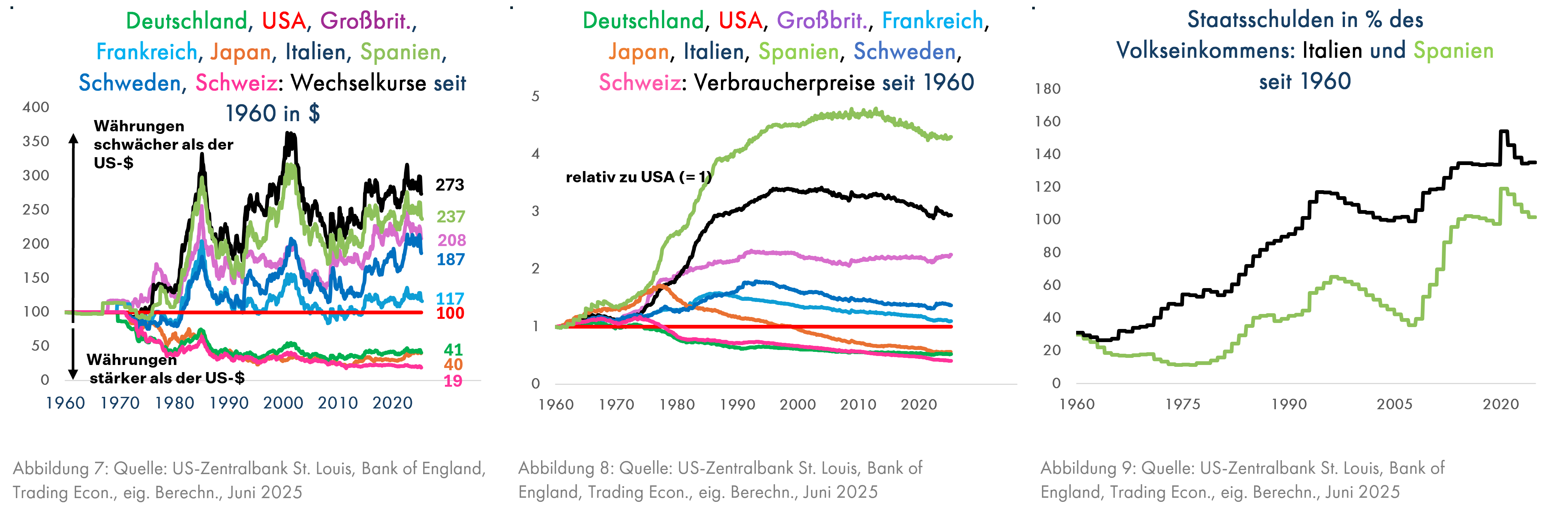 Zunächst sehen wir die Wechselkursentwicklungen verschiedener Währungen zum US-Dollar seit 1960 (Grafik 7). Damals herrschte noch das Bretton-Woods-System fester Wechselkurse, aber ab Mitte der 60er Jahre begannen die Wechselkurse zu schwanken (Lesebeispiel: aktuell braucht man das 2,73-fache der italienischen Währung (bis 2000: Lira, danach €) wie 1960, um einen US-Dollar kaufen zu können. Die Rangfolge der Linien in Grafik 7 und 8 von oben nach unten ist sehr ähnlich. Länder mit einer schwachen Wechselkursentwicklung wie Italien oder Spanien wiesen auch eine besonders hohe Inflation relativ zu den USA auf (Grafik 8). Umgekehrt haben die Währungen Deutschlands, Japans und insbesondere der Schweiz gegenüber dem Dollar deutlich zugelegt; heute braucht man nur 19% der Anzahl Schweizer Franken, die man 1960 brauchte, um einen US-Dollar kaufen zu können. Es gibt aber neben den unterschiedlichen Inflationsraten auch weitere Kennzahlen, die die Wechselkurse beeinflussen. Spanien hatte eine etwas weniger ungünstige Wechselkursentwicklung als Italien, obwohl die Konsumentenpreise deutlich stärker gestiegen waren als die italienischen (Grafik 8). Die Erklärung dafür dürfte in den Staatsschulden liegen, die insbesondere bis 2007 in Spanien weitaus geringer als in Italien waren (Grafik 9).