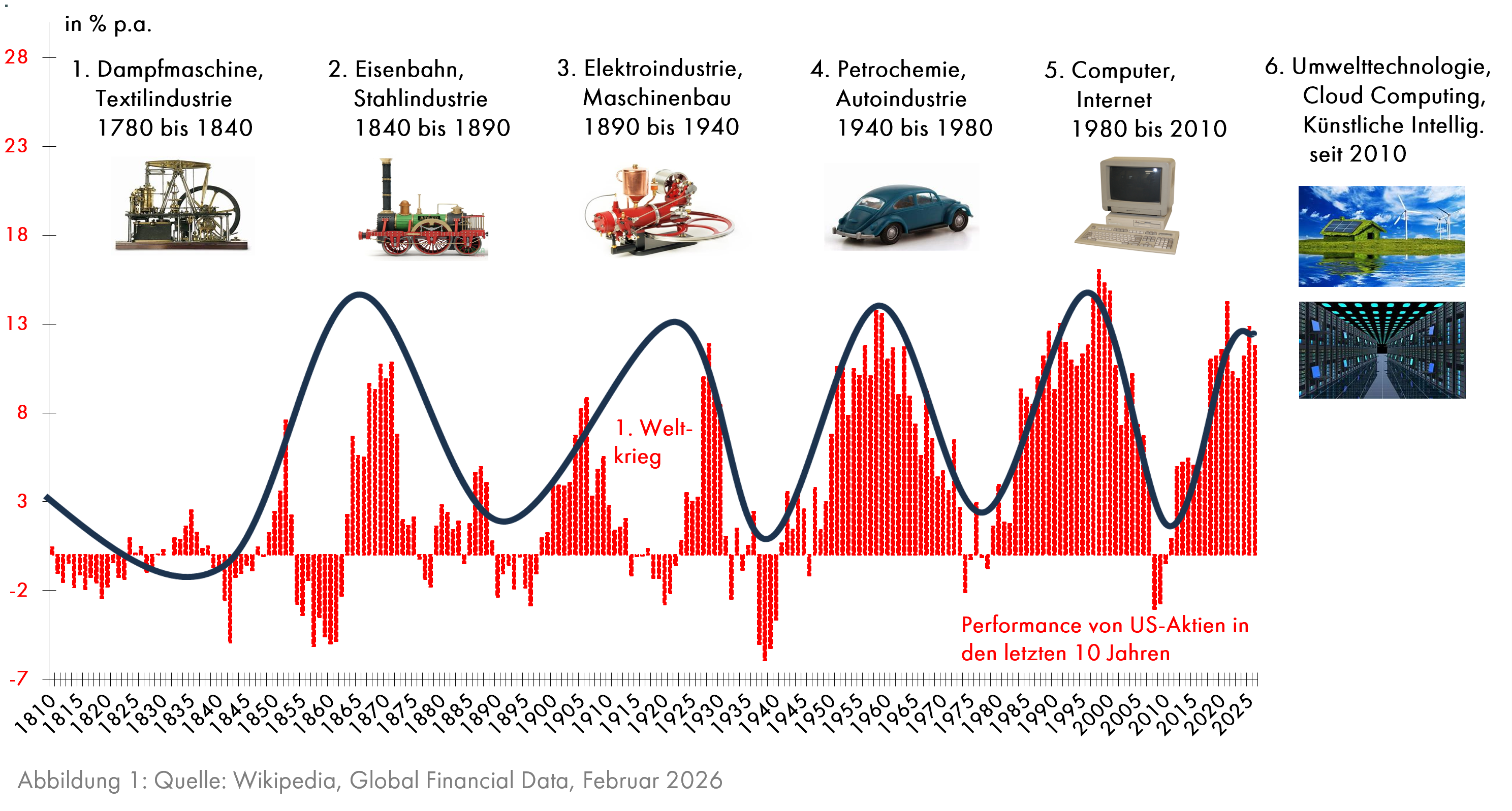 Der sowjetische Ökonom Nikolai Kondratjew (1892 -1938) wurde durch die Entdeckung von jahrzehntelangen Auf- und Abwärtsbewegungen der Weltkonjunktur seit dem Beginn der industriellen Revolution im 18. Jahrhundert berühmt. Er erkannte, dass neue Basisinnovationen – zuerst die Dampfmaschine – einen anhaltenden Aufschwung auslösten, der später durch Überkapazitäten aufgrund von zu hohen Investitionen in einen langjährigen Abschwung überging. Sein Pech war seine in den 20er Jahren veröffentlichte Erkenntnis, dass der Kapitalismus immer wieder mit Basisinnovationen eine neue Aufschwungphase erzeugt. Dies stand in direktem Widerspruch zur offiziellen marxistischen Ideologie, nach welcher der Kapitalismus dem Untergang geweiht sei. Stalin ließ ihn daher 1930 verhaften. Grafik 1 zeigt, dass Kondratjew Recht hatte; sein Konzept funktionierte gemessen an den 10-jährigen Erträgen des US-Aktienmarktes nach seinem Tod sogar noch besser als zum Zeitpunkt seiner Entdeckung, als die dritte Welle durch den 1. Weltkrieg unterbrochen worden war. Inzwischen ist nicht der Kapitalismus untergegangen, sondern der Kommunismus, und die 6. Kondratjew-Welle steht in voller Blüte, zur Zeit befeuert von dem großen Thema Künstliche Intelligenz (KI).