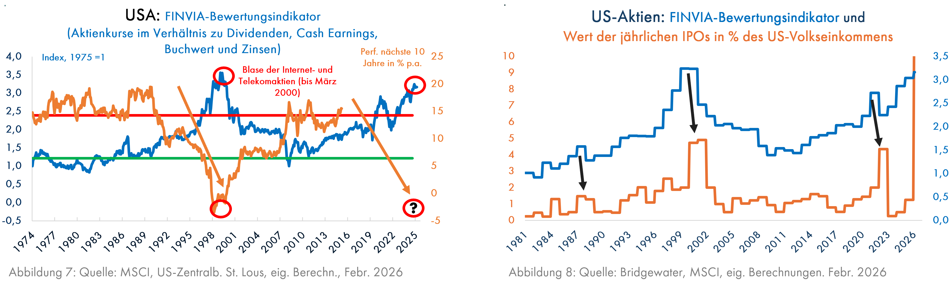 Der absehbare IPO-Boom ist nicht nur aufgrund der luftigen Geschichten und Bewertungen ein Warnsignal. Wenn der Bewertungsindikator des FINVIA-Prognosemodells für den US-Aktienmarkt sehr hoch ist oder war, wie aktuell und im Jahr 2000, ist die Performance des US-Aktienmarktes in den folgenden 10 Jahren vermutlich bis 2036 genauso negativ wie von 2000 bis 2010 (Grafik 7, orange Linie, rote Kreise). Außerdem folgte auf eine Überbewertung von US-Aktien damals wie wahrscheinlich auch heute eine Flut von Börsengängen (Grafik 8, siehe Die Top-6 möglichen IPOs für 2026 | Consorsbank vom 26.1.2026), damals aus dem Internet- und Kommunikationssektor, heute u.a. OpenAI und SpaceX. Das zu erwartende Rekordvolumen der Börsengänge (10% des US-Volkseinkommen) ist eine aktuelle Schätzung des renommierten Hedgefonds Bridgewater.