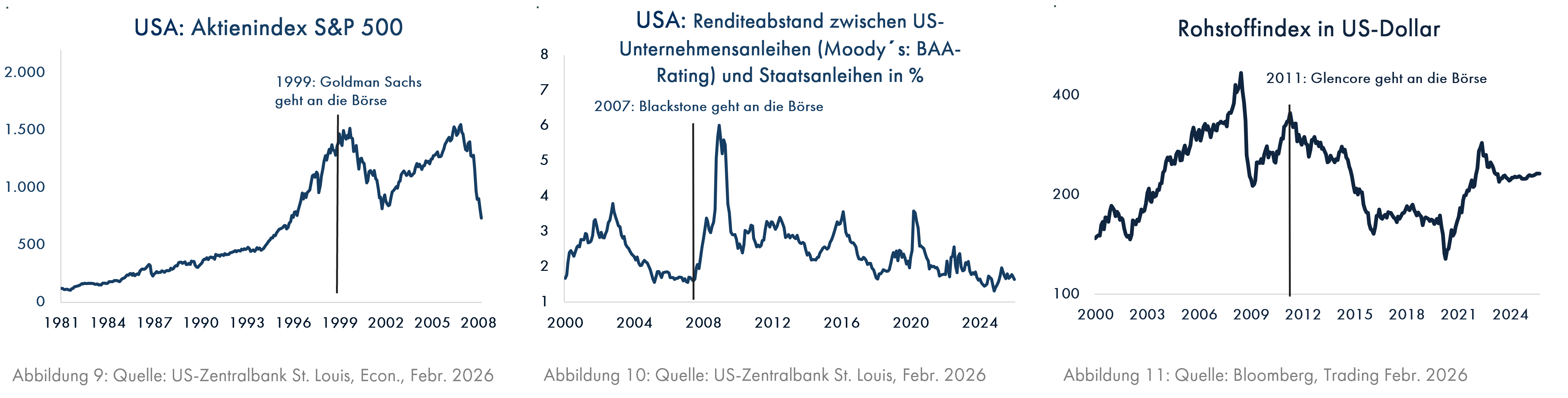 Die zu erwartenden IPOs erinnern jedoch an eine wissenswerte Regel aus früheren Jahren. Wenn ein bis dahin nicht börsennotierter Platzhirsch einer Branche an die Börse geht, erwischt er meistens einen für ihn, aber nicht für die neuen Aktionäre besonders günstigen Zeitpunkt. Nach dem Börsengang der noblen Investmentbank Goldman Sachs, 1999 berühmt für die Begleitung zahlreicher Börsengänge von Internet- und Kommunikations-IPOs, brach der Technologieaktien-Index NASDAQ um 80% ein (Quelle: US-Zentralbank St. Louis) und auch der gesamte US-Aktienmarkt hatte eine sehr holprige Zukunft mit zweimaligem Kursrückgang von ca. 50% vor sich (Grafik 9); der große Aufschwung der US-Aktien begann erst 2009. Nach dem Börsengang von Blackstone, schon 2007 ein Gigant im Private Equity-, Immobilien und Kreditgeschäft, schossen die Risikoprämien von Unternehmensanleihen nach oben (Grafik 10) und deren Kurse nach unten. Auch die Aktien-, Immobilien- und Kreditmärkte brachen weltweit infolge der von stark fallenden US-Immobilien ausgelösten Finanzkrise ab Ende 2007 ein, siehe auch Grafik 9. Auf den Börsengang des weltgrößten Rohstoffhändlers Glencore folgte eine tiefe Eiszeit für Rohstoffanlagen (Grafik 11). Alle drei Firmen hatten den optimalen Zeitpunkt für einen Börsengang erwischt.