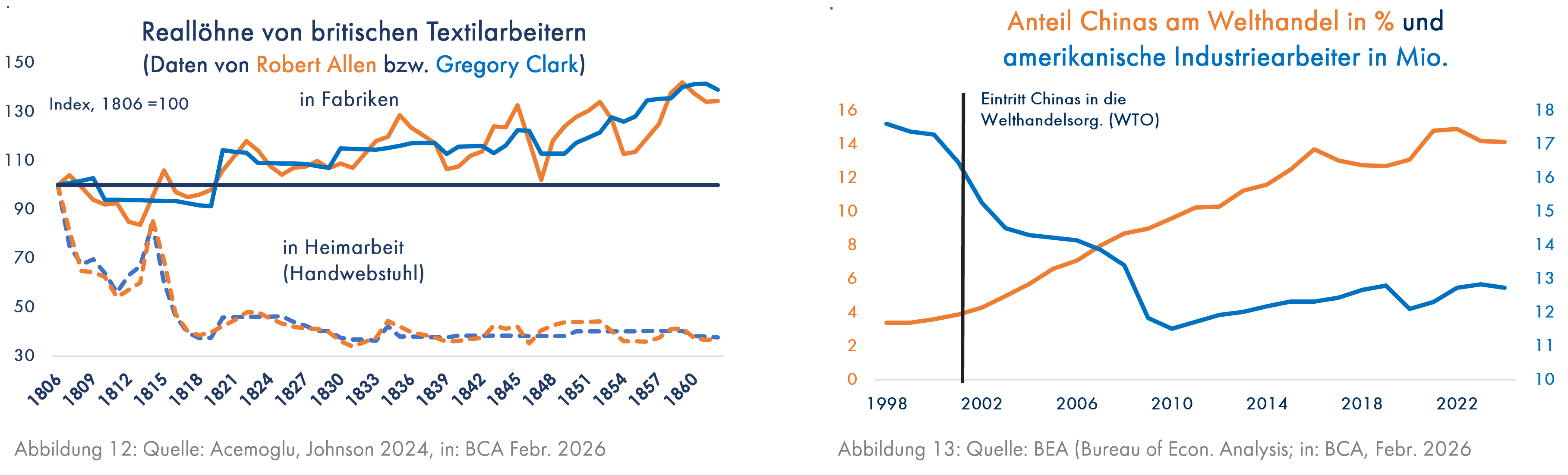 Das Internet ist nach den Boomjahren 1999 und 2000 weitergewachsen, anders als die Kurse der damals meist völlig überteuerten IPOs. Ebenso wird es der KI ergehen. Diese wird sich rasant weiterentwickeln, aber die KI-IPOs sollte man großzügig anderen Investoren überlassen. Die wahrscheinlichen Auswirkungen von KI auf die Wirtschaft hat die renommierte kanadische Researchfirma Bank Credit Analyst (BCA) kürzlich anhand von 2 Beispielen verdeutlicht. Grafik 12 zeigt die reale Einkommensentwicklung von Textilarbeitern in Großbritannien nach der Erfindung der Webmaschinen und deren Einsatz in Fabriken. Diejenigen Arbeiter, die in den neuen Textilfabriken gelernt hatten, die neuen Webmaschinen zu bedienen, erhielten steigende reale Arbeitslöhne. Die anderen, die weiterhin in Heimarbeit ihren gewohnten Handwebstuhl benutzten, mussten aufgrund ihrer geringeren Produktivität starke reale Lohneinbußen hinnehmen. Als zweites Beispiel dient der Eintritt Chinas in die Welthandelsorganisation WTO im Dezember 2001. Plötzlich konnten chinesische Industriefirmen ihre aufgrund der geringen chinesischen Arbeitslöhne billigen Produkte in den USA verkaufen. Daraufhin verloren viele amerikanische Industriearbeiter ihren Job (Grafik 13). Übertragen auf die heutige Situation bedeutet dies, dass diejenigen Arbeitskräfte und Unternehmen, die lernen, KI sinnvoll einzusetzen, künftig besser dastehen werden, während die übrigen mit Einnahmeverlusten rechnen müssen.