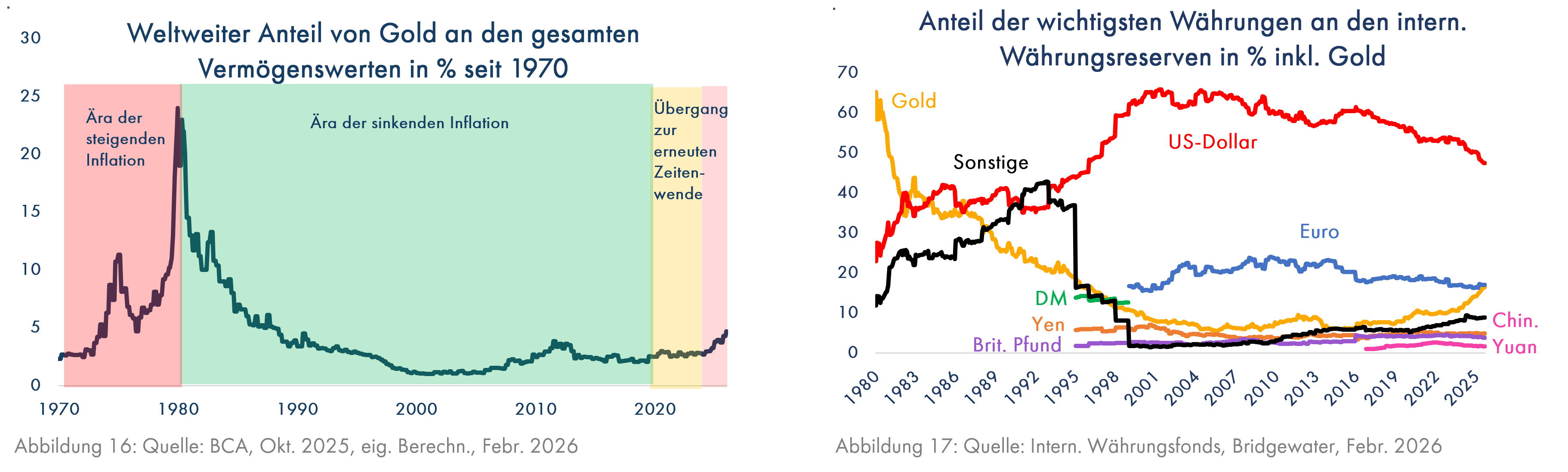 Trumps Unfähigkeit wirkt sich zunehmend auf den Status des US-Dollars als führende Reservewährung der internationalen Zentralbanken aus, die ebenso wie die weltweiten Investoren (Grafik 16) wieder mehr Gold statt US-Staatsanleihen halten wollen (Grafik 17). Manch ein Goldkäufer mag sich auch im ersten Regierungsjahr Trumps daran erinnert haben, dass die von Trump ganz offen gelebte Korruption ein langfristig stark negativer Einflussfaktor für die wirtschaftliche Entwicklung ist (siehe dazu den Kapitalmarktausblick vom Januar 2026, den Sie hier finden; sehr lesenswert ist das Buch „Warum Nationen scheitern“ der beiden Wirtschaftsnobelpreisträger des Jahres 2024 Daron Acemoglu und James A. Robinson). Eine schwächere US-Wirtschaft dürfte die Bedienung der gewaltigen US-Staatsschulden erschweren und das Vertrauen in US-Staatspapiere weiter schwächen. Während der Euro seit seiner Geburt den Anteil an den Zentralbank-Währungsreserven leicht von 16,7% auf 17% steigern konnte, sank der Anteil des US-Dollars im selben Zeitraum von 62,2% auf 47,5% ab, zuletzt mit wachsender Geschwindigkeit. Der große Gewinner ist das Gold, dessen Anteil in den letzten Jahren auf 16,5% anstieg.