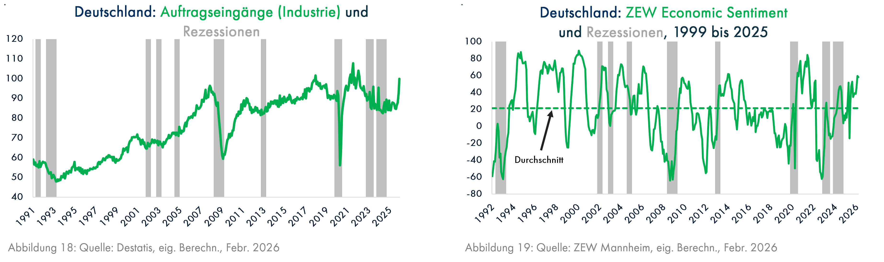 Ein schwacher US-Dollar hat nicht nur negative Auswirkungen. Die deutsche Wirtschaft mag dadurch Einbußen beim Export erleiden, aber möglicherweise wird dieser Effekt durch die Investitionen der deutschen Regierung in Rüstung und Infrastruktur mehr als ausgeglichen. Die Auftragseingänge der Industrie steigen jedenfalls seit November 2025 kräftig an (Grafik 18) und die vom Zentrum für europäische Wirtschaftsforschung befragten institutionellen Anleger und Finanzanalysten sind zuletzt deutlich optimistischer geworden. In der Vergangenheit hat dieser Indikator Rezessionen, aber auch Aufschwünge rechtzeitig und zuverlässig angezeigt (Grafik 19; die grüne Linie fiel regelmäßig schon deutlich vor einer Rezession (grauer Balken) stark und stieg dann schon am Beginn einer Rezession wieder an). Für eine nachhaltige Aufwärtsentwicklung sind allerdings die allseits bekannten Reformen zwingend erforderlich. Ohne Konzentration des aufgeblähten Sozialstaates auf die Hilfe für wirklich Bedürftige und ohne Einschnitte im Bürokratiedschungel wird das Erzielen von Wirtschaftswachstum immer schwieriger werden. Da wird Bundeskanzler Merz liefern müssen, sonst ist der Investitionsboom nicht nachhaltig.