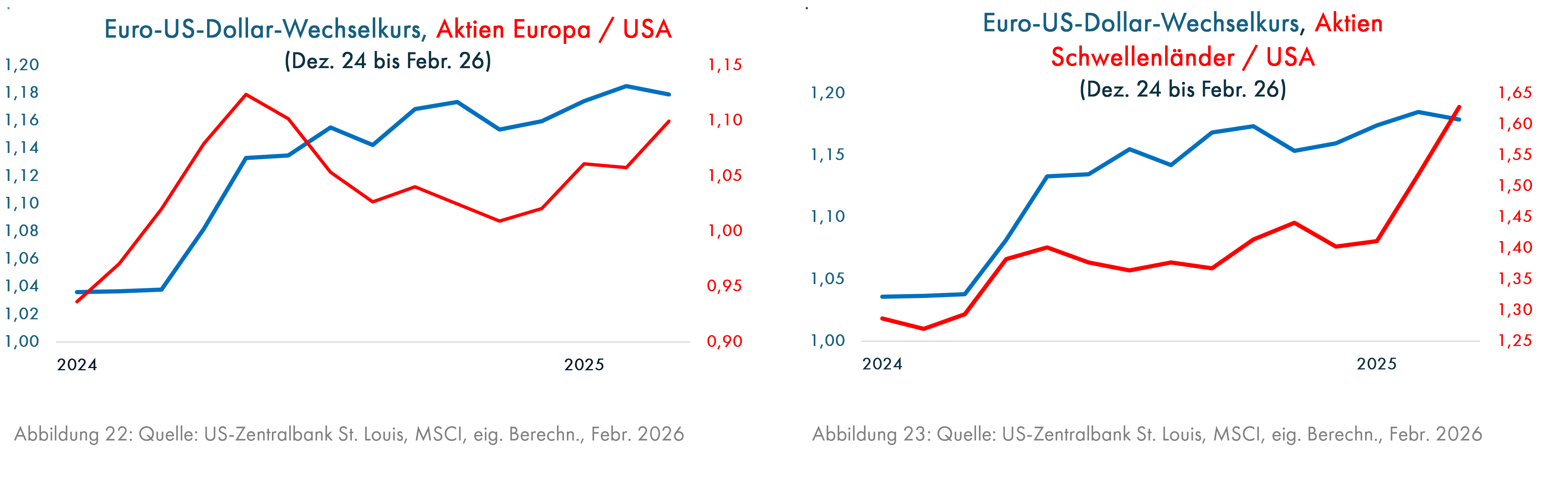 Die Trendwende der roten Linien in den beiden roten Kreisen sieht noch sehr unbedeutend aus. Wenn man aber die beiden roten Kreise unter die Lupe nimmt, erkennt man, dass die Outperformance des europäischen Aktienmarktes im Vergleich zum amerikanischen recht kräftig ist (Grafik 22). Sie erreicht bereits 17%. Die Schwellenländer-Aktienkurse sind seit Ende 2024 sogar um 29% besser als US-Aktien gelaufen (Grafik 23).
