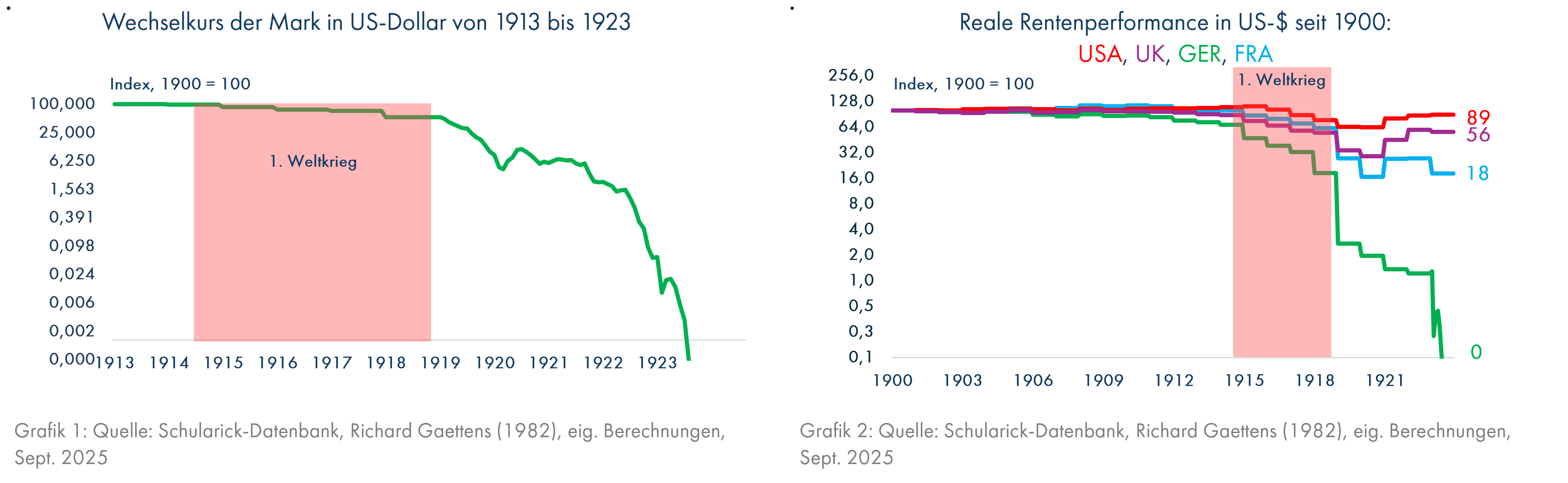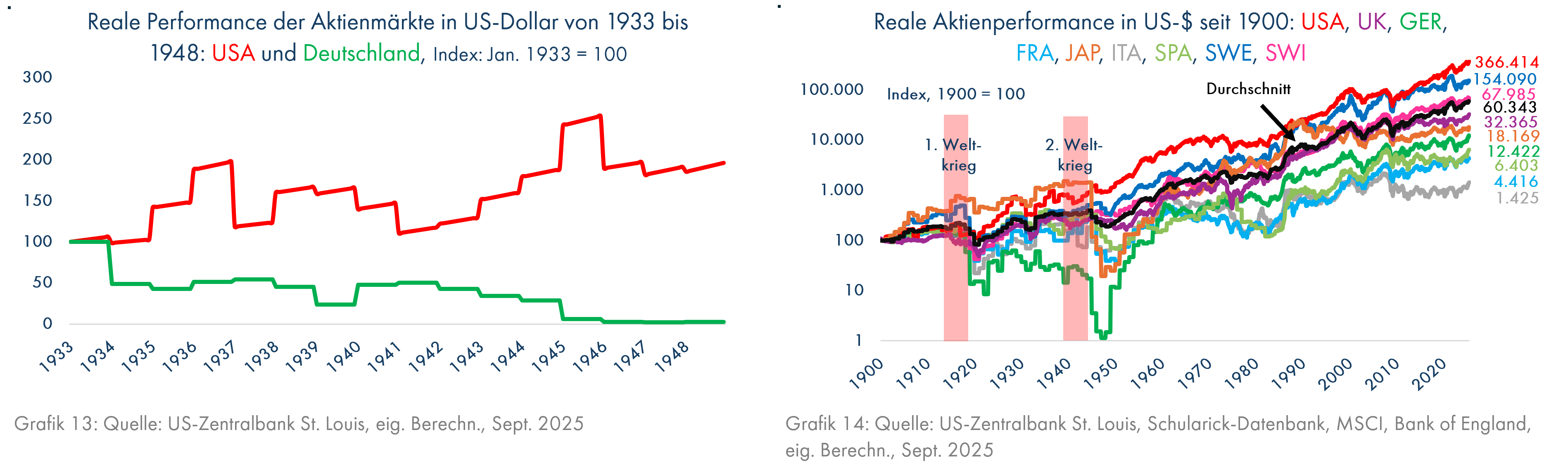 Am schlimmsten war die Entwicklung in Deutschland seit 1933 – politisch, menschlich und wirtschaftlich. Hitlers Politik bewirkte für Kapitalanleger katastrophale Resultate. Die Entwicklung des Wechselkurses bis 1949 gibt eine Indikation der Wertentwicklung von festverzinslichen Anlagen, nämlich Verluste von über 90%; exakte Daten sind für die chaotischen 40er Jahre nicht erhältlich (Grafik 8). Auch der Sachwert Aktie litt bis 1948 (Währungsreform) massiv (Grafik 13), allerdings konnten sich deutsche Aktien in den 50er Jahren sehr stark erholen. Die Deutschen wurden - auch als Kapitalanleger - massiv für ihre Gutgläubigkeit gegenüber den fragwürdigen Zielen des „Führers“ bestraft. Putins Begründungen für seinen Krieg gegen die Ukraine waren die Behauptung, die NATO habe Russland eingekreist, was überwiegend, aber nicht ganz falsch ist, und die russischstämmige Bevölkerung müsse vor einem mordenden ukrainischen Nazi-Regime gerettet werden (Quelle: Bundeswehr: Die russische Rechtfertigung des Krieges gegen die Ukraine). Der türkische Präsident Erdogan, der den Putschversuch im Sommer 2016 nutzte, um seine Macht auszuweiten, beschimpfte die Europäer als Faschisten und beschuldigte speziell die Niederländer, 8.000 muslimische Bosnier umgebracht zu haben, selbstverständlich ohne irgendwelche Beweise dafür vorlegen zu können (Quelle: Deutschlandfunk: Faschismus-Vorwürfe - "Erdogan spielt mit der Unkenntnis im kollektiven Gedächtnis").