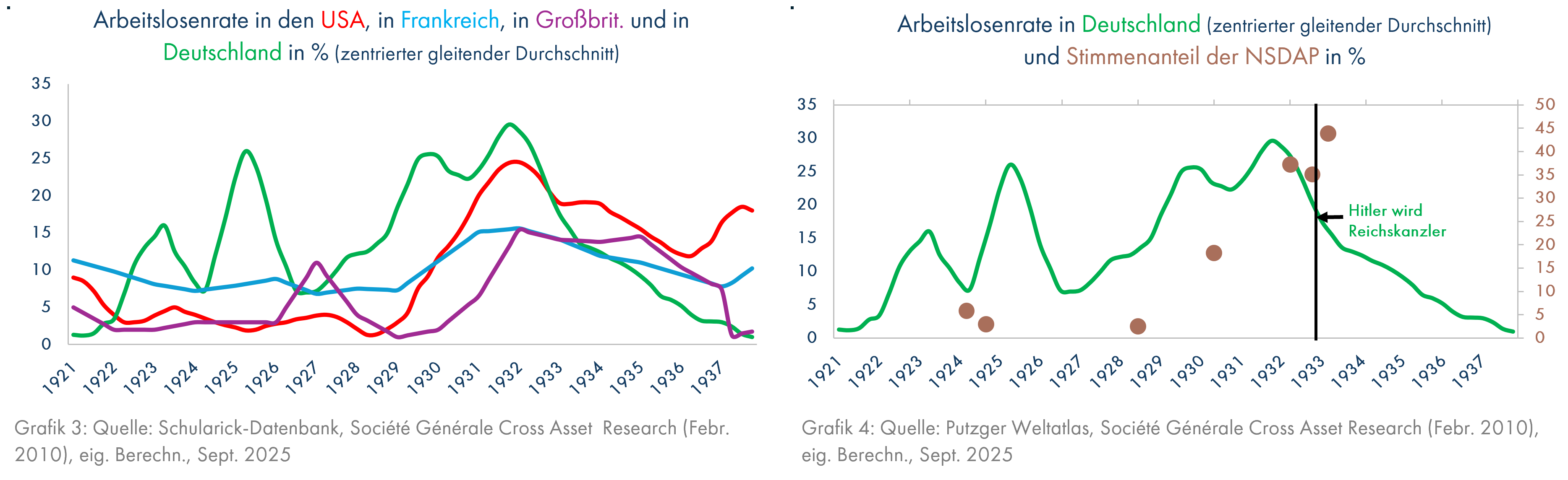 Die Amerikaner hatten den Deutschen ab 1924 großzügig Kredite gegeben, aber diese Scheinblüte – die „Goldenen zwanziger Jahre“ – endete aufgrund der labilen Verfassung der deutschen Wirtschaft und der hohen Kriegsentschädigungen, die Deutschland zahlen musste, bereits im Herbst 1928. Als im Herbst 1929 die US-Aktienkurse dramatisch einbrachen, wurde das amerikanische Kapital wieder abgezogen und die deutsche Wirtschaftskrise beschleunigte sich. Die Arbeitslosenrate stieg für mehrere Jahre auf 20-30%. Die älteren Deutschen hatten gerade ihr Geldvermögen verloren und nun verloren die Jüngeren ihren Arbeitsplatz. Dies nutzte Hitler aus, ein ökonomischer Laie, der mit wenig faktenbasierter Propaganda viele verzweifelte Wähler überzeugte. Er suchte die Schuldigen für die deutsche Misere im Ausland („das angelsächsische Großkapital“, der „Bolschewismus“) und war damit erfolgreich (Grafik 4); am 30. Januar 1933 wurde er zum Reichskanzler ernannt.