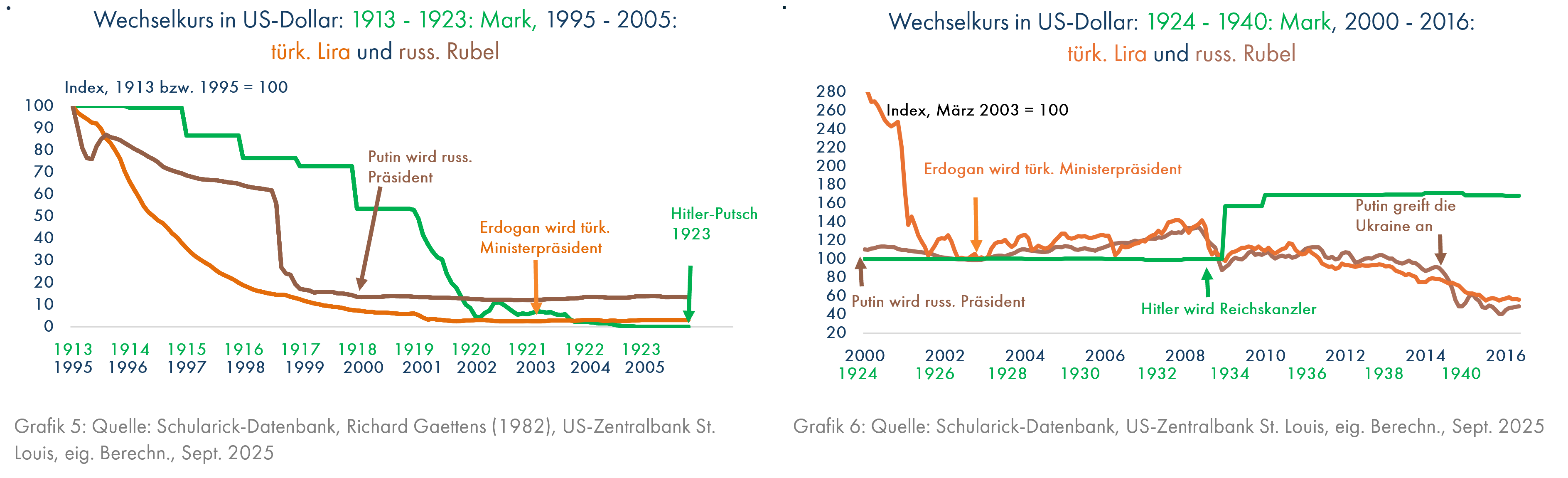 Auch andere Staatschefs kamen nach starken Inflationsschüben, dokumentiert durch einen massiven Zusammenbruch des jeweiligen Wechselkurses, und entsprechendem Vertrauensverlust der Bevölkerung an die Macht oder unternahmen wie Hitler im Jahr 1923 einen entsprechenden (erfolglosen) Versuch (Grafik 5). Sie bedienten sich zwecks Rechtfertigung von Machterhalt und aggressiver Machtausübung der Beschuldigung von Ausländern, sobald die wirtschaftliche Erholungsphase nach ihrem Machtantritt ins Stocken geriet.