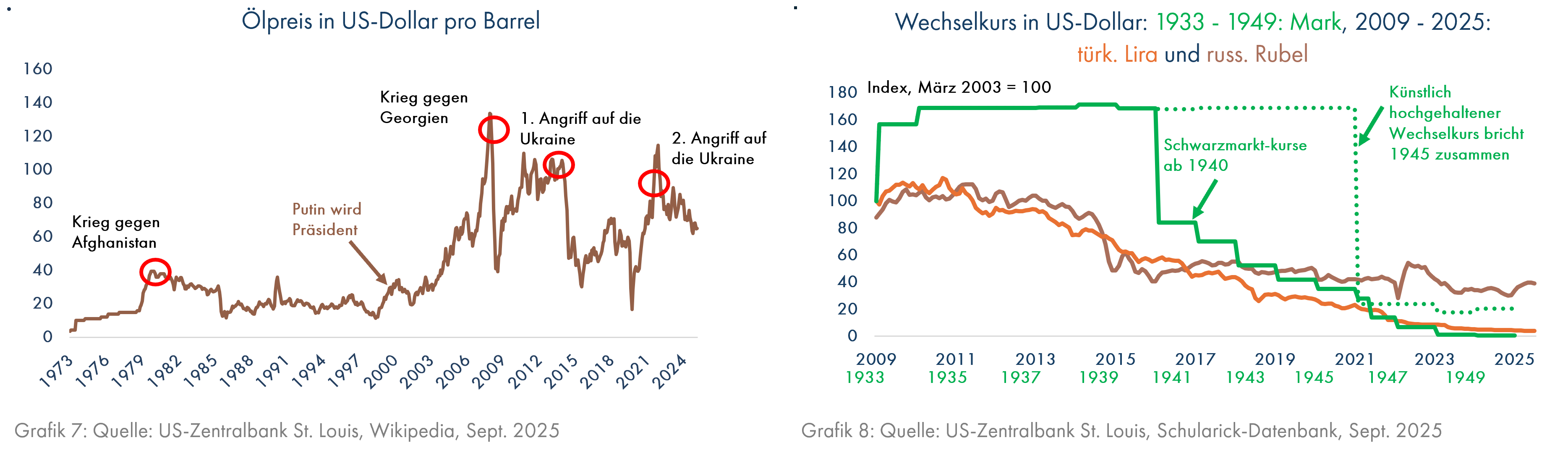 Zunächst konnten Putin und Erdogan, die einige Jahre brauchten, um Diktator zu werden, sowie Hitler, der nach wenigen Wochen alle Fäden in der Hand hatte, nach ihrem Machtantritt einen wirtschaftlichen Aufschwung vorweisen. Die Währungen erholten sich deutlich (Grafik 6). Allerdings hatte dies nichts mit den Fähigkeiten der neuen Führer zu tun. Russlands Wirtschaft und auch seine Währung (siehe Grafik 6) erlebten nach dem Jahr 2000 einen Höhenflug, weil der für die russische Wirtschaft besonders wichtige Ölpreis in den ersten 8 Jahren von Putins Präsidentschaft einen extrem starken Anstieg verzeichnete (Grafik 7). Erdogan profitierte davon, dass die Türkei einen 20 Mrd. US-Dollar-Kredit des Internationalen Währungsfonds (IWF) erhielt und die damit verbundenen vernünftigen Auflagen zur Restrukturierung der türkischen Wirtschaft umgesetzt werden mussten (Quelle: Erdogans Wirtschaftswunder | Internationale Politik). Daraufhin stieg die türkische Lira zum US-Dollar bis 2008 um über 40% (Grafik 6). Der Anstieg der deutschen Währung im Jahr 1933 war eine Folge der bereits im Jahr 1931 eingeführten Kapitalverkehrskontrollen, die ab 1933 massiv verschärft wurden. Da man nun keinen Kapitalabfluss mehr befürchten musste, konnte man den Wechselkurs der Reichsmark zum Gold auch dann unverändert lassen, als die USA ihren Dollar zum Gold kräftig abwerteten. So schien die Reichsmark den inflationsgeschädigten Deutschen besonders stabil zu sein. Außerdem verschleierte die deutsche Regierung die wachsende staatliche Verschuldung sehr geschickt durch die sogenannten Mefo-Wechsel (die Metallurgische Forschungsanstalt war eine Scheinfirma), die eine wirtschaftliche Scheinblüte ohne erkennbare Verschuldung vortäuschten. Der deutsche Staatshaushalt durfte ab 1935 nicht mehr veröffentlicht werden. „In ihrer Propaganda prahlten die NS-Führer, sie würden das Fundament für das Tausendjährige Reich legen, im Alltag wussten sie nicht, wie sie am nächsten Morgen ihre Rechnungen begleichen sollten“ (Quelle: Götz Aly: Hitlers Volksstaat, 2005).