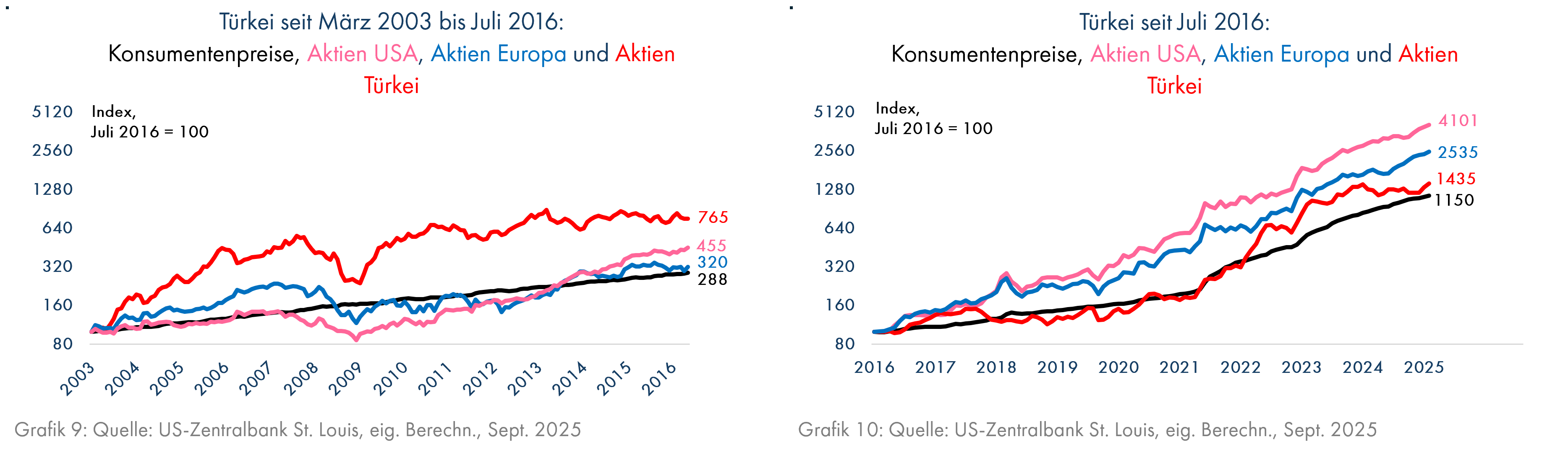 Die finanziellen Folgen des diktatorischen Dilettantentums lassen sich gut am Beispiel der Türkei aufzeigen. Solange Präsident Erdogan noch die vom IWF diktierten Maßnahmen umsetzen musste und die Inflation mit durchschnittlich 8,5% p.a. moderat blieb, konnte der türkische Aktienmarkt deutlich höhere Kursgewinne erzielen als die Aktien Europas oder der USA (Grafik 9, alle Angaben in türkischer Lira). Sobald er aber ab Juli 2016 den gescheiterten Putschversuch nutzte, um seine Macht auszudehnen und bald danach die Zentralbank unter seine Kontrolle stellte, konnten türkische Aktien zwar noch mit der Inflation in Höhe von über 30% p.a. mithalten, aber europäische und amerikanische Aktien waren nun die weitaus bessere Anlage (Grafik 10).