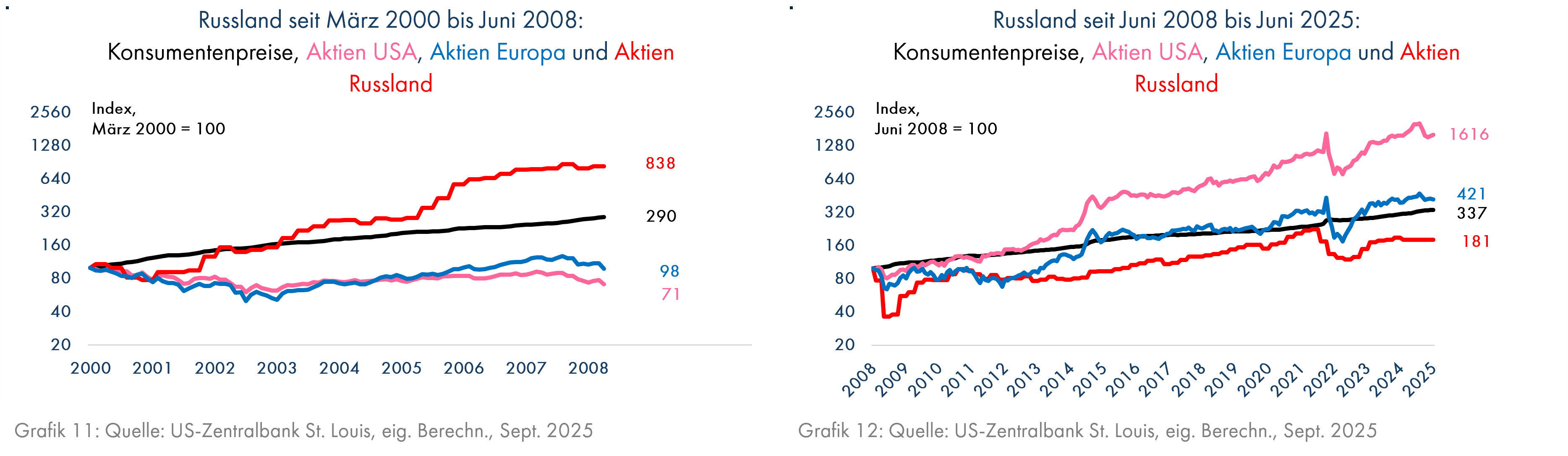 Die Entwicklung in Russland verlief genauso. Solange der Ölpreis boomte und Putin bis 2008 friedlich blieb, waren russische Aktien eine sehr gute Anlage (Grafik 11). Dann wiederholte er jedoch den Fehler seiner sowjetischen Vorgänger, die 1979 bei einem bis dahin rekordhohen Ölpreis, letztlich erfolglos, Afghanistan überfielen, bei sehr hohen Ölpreisen Krieg zu führen (Grafik 7). Immer wenn aufgrund der Ölpreise die Kasse gut gefüllt war, inszenierte er einen Krieg (gegen Georgien (2008) und gegen die Ukraine (2014 und 2022)). Nun konnten russische Aktien nicht einmal die Inflation ausgleichen und fielen weit hinter die Aktienmärkte in den USA und in Europa zurück (Grafik 12).