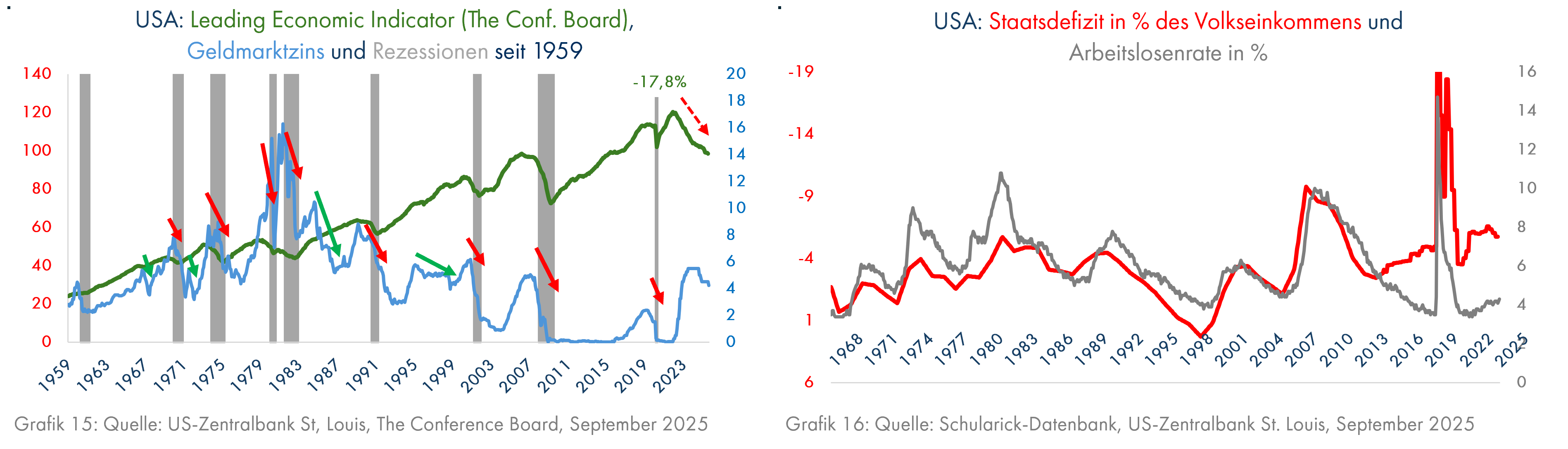 Tatsächlich hatten Zinssenkungen von über 100 Basispunkten in einem Zeitraum von mindestens 12 Monaten wie seit August 2024 durchaus Aktienkurssteigerungen zur Folge (Grafik 17 zeigt diese 5 Phasen seit 1961 mit abwärts gerichteten blauen Balken (Zinssenkungen) und aufwärtsgerichteten roten Balken), allerdings nur dann, wenn auch der grüne Balken nach oben zeigt. Dieser deutet dann auf verbesserte Aussichten und auf einen wirtschaftlichen Aufschwung hin. Wenn sich dagegen die wirtschaftlichen Aussichten verschlechterten, gab es bisher nur einmal, nämlich bis zum Oktober 1990, einen schwachen Anstieg der Aktienkurse (Grafik 18). Noch nie gab es einen so massiven Aktienkursanstieg wie 2025, während sich die wirtschaftlichen Aussichten deutlich verschlechterten. Die vom Leading Economic Indicator seit über 3 Jahren angekündigte Rezession (Grafik 15) blieb bisher aus zwei Gründen aus. Den einen nennt neuerdings völlig zu Recht die Deutsche Bank (Quelle: Deutsche Bank warnt: Nur KI-Blase hält US-Wirtschaft noch zusammen - Golem.de), der andere besteht in der außergewöhnlich hohen Neuverschuldung der USA in den letzten Jahren trotz sehr niedriger Arbeitslosigkeit (Grafik 16). Beide Gründe werden nicht ewig anhalten; die Wahrscheinlichkeit und die schädlichen Folgen einer US-Rezession werden unterschätzt.