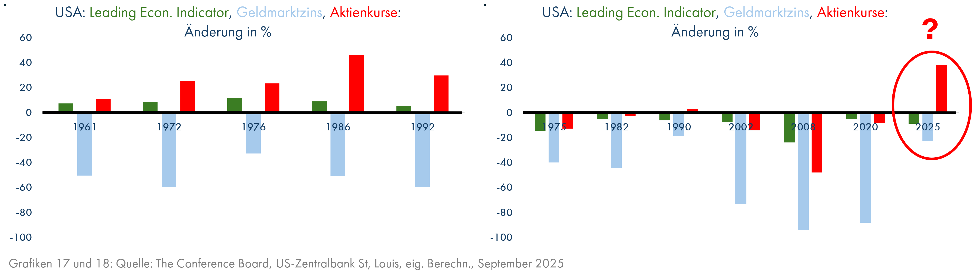 Die jüngste am Aktienmarkt bejubelte Nachricht war die allseits erwartete Zinssenkung der US-Zentralbank, bei genauem Hinsehen der winzige Knick der blauen Linie nach unten in Grafik 15.