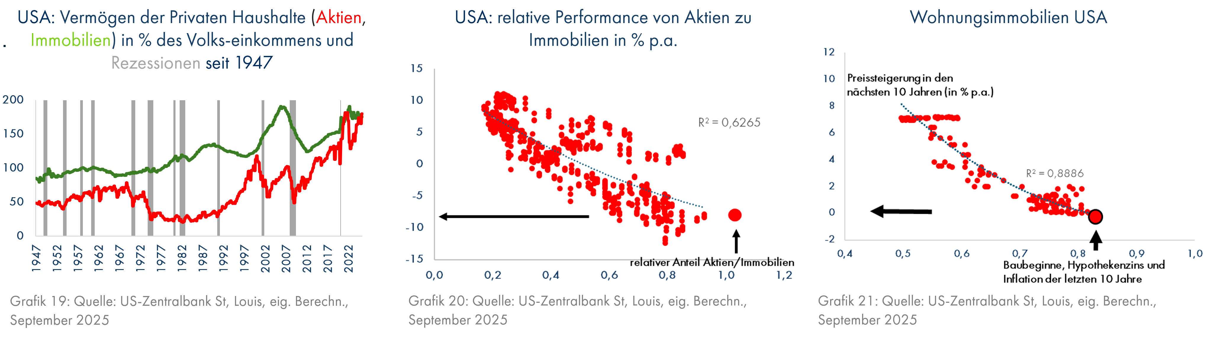 Die Zahl der weiteren Warnsignale nimmt zu. Seit 1947 war der Aktienbesitz im Vermögen der Privaten Haushalte außer im Jahr 2025 nur im Jahr 2021 genauso hoch wie der Besitz von Wohnimmobilien (Grafik 19). Daraus lässt sich seit 1963 ein recht gutes Prognosemodell für die relative Performance von US-Aktien zu US-Wohnimmobilien erstellen (Grafik 20). Das ernüchternde Resultat lautet: In den nächsten 10 Jahren werden Aktien um 8%-Punkte p.a. schlechter als Wohnimmobilien abschneiden. Aber auch für diese sind die Aussichten nicht besonders rosig (Grafik 21); das Prognosemodell, das genauso aufgebaut ist wie das Modell für deutsche Wohnimmobilien (siehe Kapitalmarktausblick vom Juli 2025, den Sie hier finden), erwartet keine Wertsteigerungen von US-Wohnimmobilien.