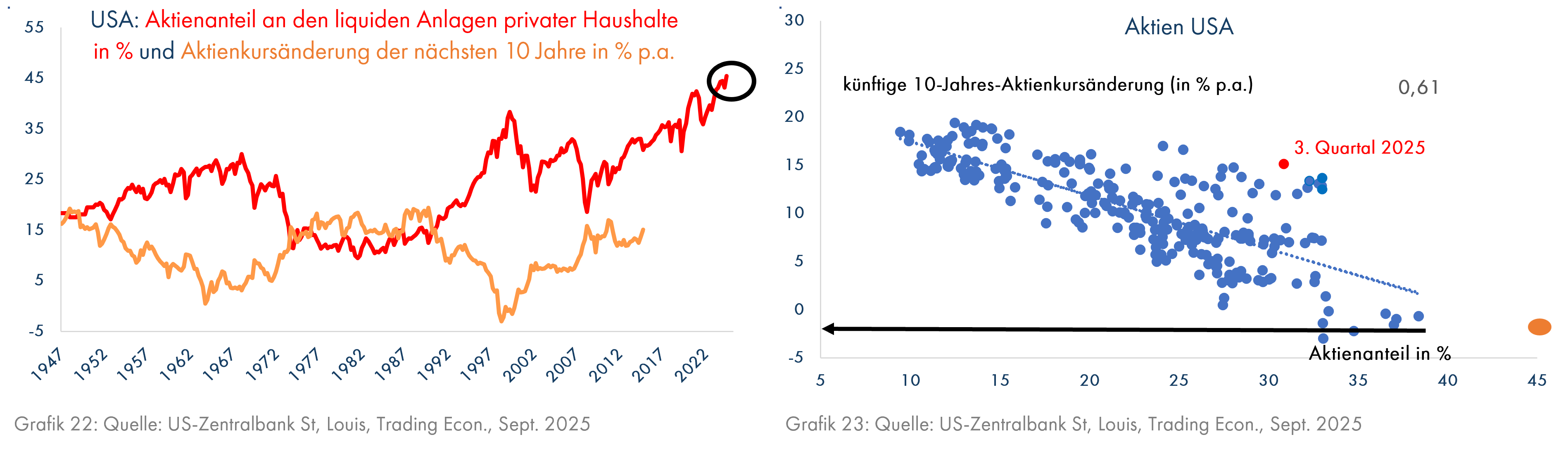 Eine neue Zahl der US-Zentralbank zum Anteil der Aktien am liquiden Vermögen der Privaten Haushalte in den USA trägt ebenfalls nicht zur Beruhigung bei. Der aktuelle Wert von 45,4% ist der höchste, seit diese Zahl ab dem Jahr 1947 erhoben wird. Sie übertrifft auch den langjährigen Rekordwert vom 1. Quartal 2000 (38,4%), als die damalige Technologie-, Internet- und Telekomblase ihren Höhepunkt erreicht hatte (Grafik 22). Leider weist auch diese Zahl einen beachtenswerten Zusammenhang zu den Aktienkursgewinnen der nächsten 10 Jahre auf und signalisiert zur Zeit leicht negative jährliche Kursänderungen (Grafik 23).