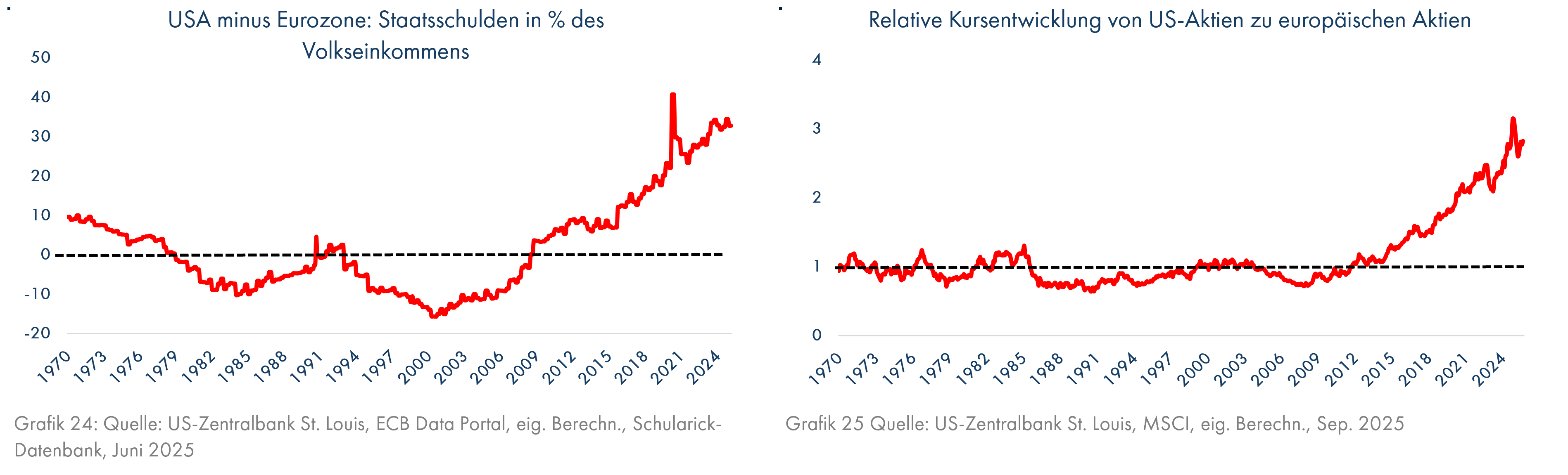 Eine weitere Problemzone ist die Tatsache, dass sich die USA von 2015, als die US-Verschuldung in % des Volkseinkommens 7%-Punkte über derjenigen der Eurozone lag, weitaus stärker verschuldet haben als die Regierungen der Eurozone (Grafik 24). Jetzt liegt der US-Wert 33%-Punkte höher. Entsprechend wurde die US-Wirtschaft stärker angetrieben (siehe auch Grafik 16) und in deren Windschatten auch der US-Aktienmarkt (Grafik 25). Sollten die Käufer von US-Staatsanleihen bei weiterer Aufblähung der US-Verschuldung streiken, dürften die Zinsen steigen oder der Dollar fallen oder beides gleichzeitig passieren. Insbesondere der europäische Besitzer von US-Aktien würde dabei nicht gut abschneiden.