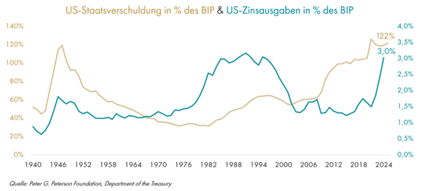 Und das trifft die USA dort, wo es wehtut. Mit einem Haushaltsdefizit von rund 6,9 % des Bruttoinlandproduktes aus dem Vorjahr und einer Neuverschuldung von über zwei Billionen US-Dollar haben die Vereinigten Staaten kaum Spielraum für höhere Zinsen. Die Gesamtverschuldung liegt mittlerweile bei über 120 % des Bruttoinlandsprodukts (Dezember 2024) – ein Niveau, das zuletzt nach dem Zweiten Weltkrieg erreicht wurde. Der Schuldendienst ist schon jetzt der zweitgrößte Posten im Staatshaushalt – noch vor den Ausgaben für Gesundheit und Militär, nur übertroffen von Sozialleistungen.