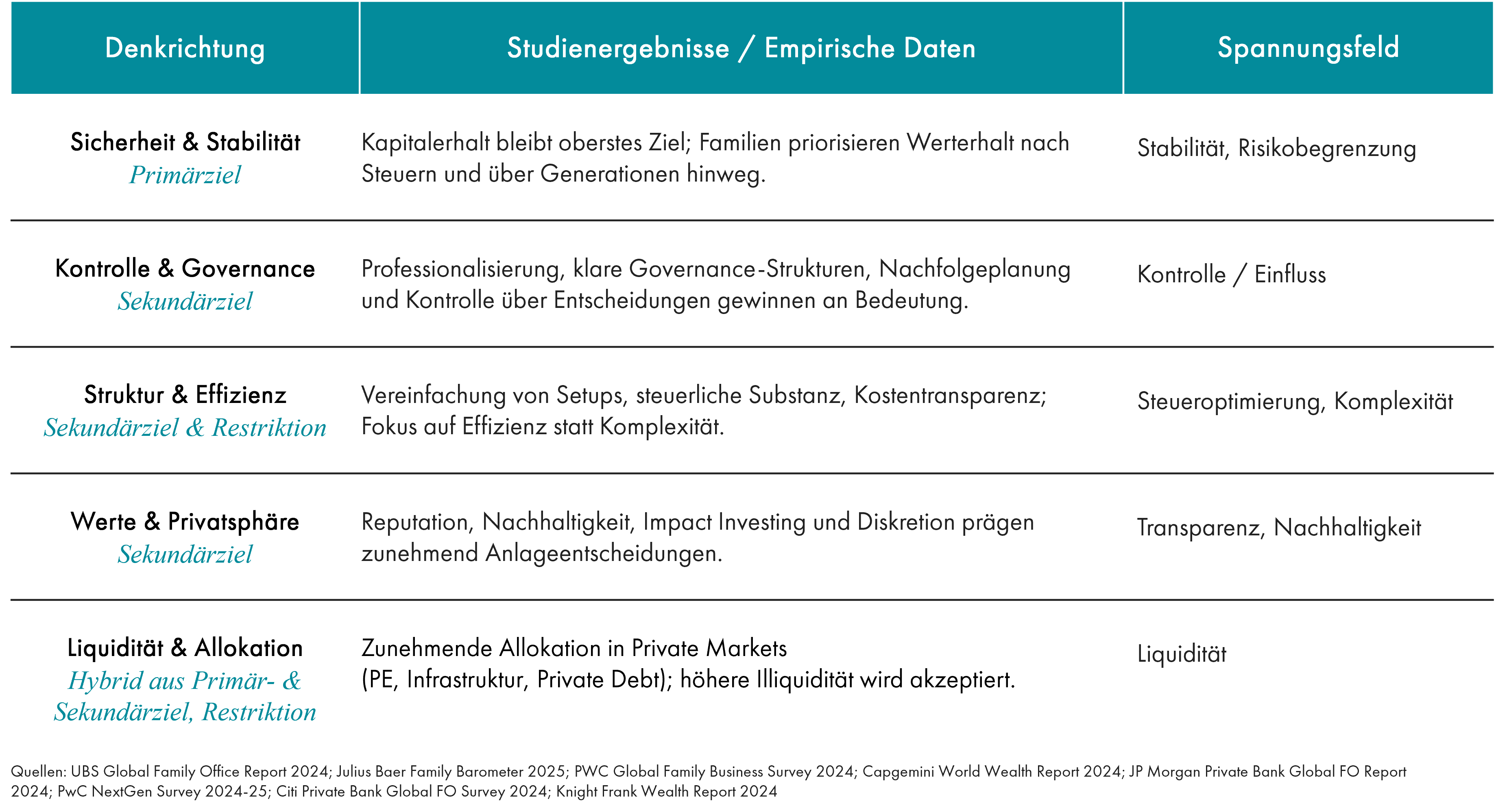 Diese Zielstruktur lässt sich nicht nur theoretisch begründen, sondern auch empirisch belegen. Internationale Studien von UBS, Julius Bär, Campden Wealth oder EY zeigen regelmäßig, welche Themen vermögende Privathaushalte und Hochvermögende beschäftigt.